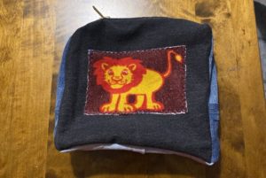 Lahjapussukka 4.11.2025 Tein tämän pussukan farkkutilkuista ja vetoketjusta. Leijonan leikkasin lasten vanhasta paidasta. Ennen ompelua liimasin siihen liimakankaan.