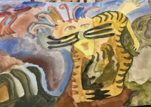 Kissa kallioilla 7.2.2024 Tämä on lyijykynäpiirros ja vesivärit antoivat värit. Aloitin noista luomista ja silmistä. Kissa sai raitansa viimeisenä.