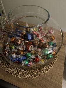 Mies haki konvehdit kaupasta. Kukkamaljakko muuttui suklaakonvehtien paikaksi ja joulupallot saivat lähteä toiseen paikkaan.