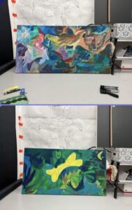 Maalaukset kehyksiin 2.4.2024 Kuvassa on minun maalaamat kankaat kehyksissä. Heidi kehysti maalaukset.