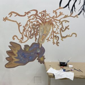 Taidekoulun projektityö jatkuu 26.1.2024 Taidekoulun projektityö jatkuu. Toinen maalauspäivä menossa. Mekko sai kuviot ja hiusten rajaus alkaa, jatkuu huomenna. Tällainen työ on tässä vaiheessa.