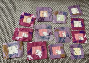 Kiitos! Kankaissa sävy ja kuvio on tärkeä. Ompelin ensin nuo Muumit ja sitten sain tuon Liilan kankaan ja aloitin tekemään sitä. Löysin kierrätyksestä tuon pinkin Muumi-kankaan. Pesin ensin sen.