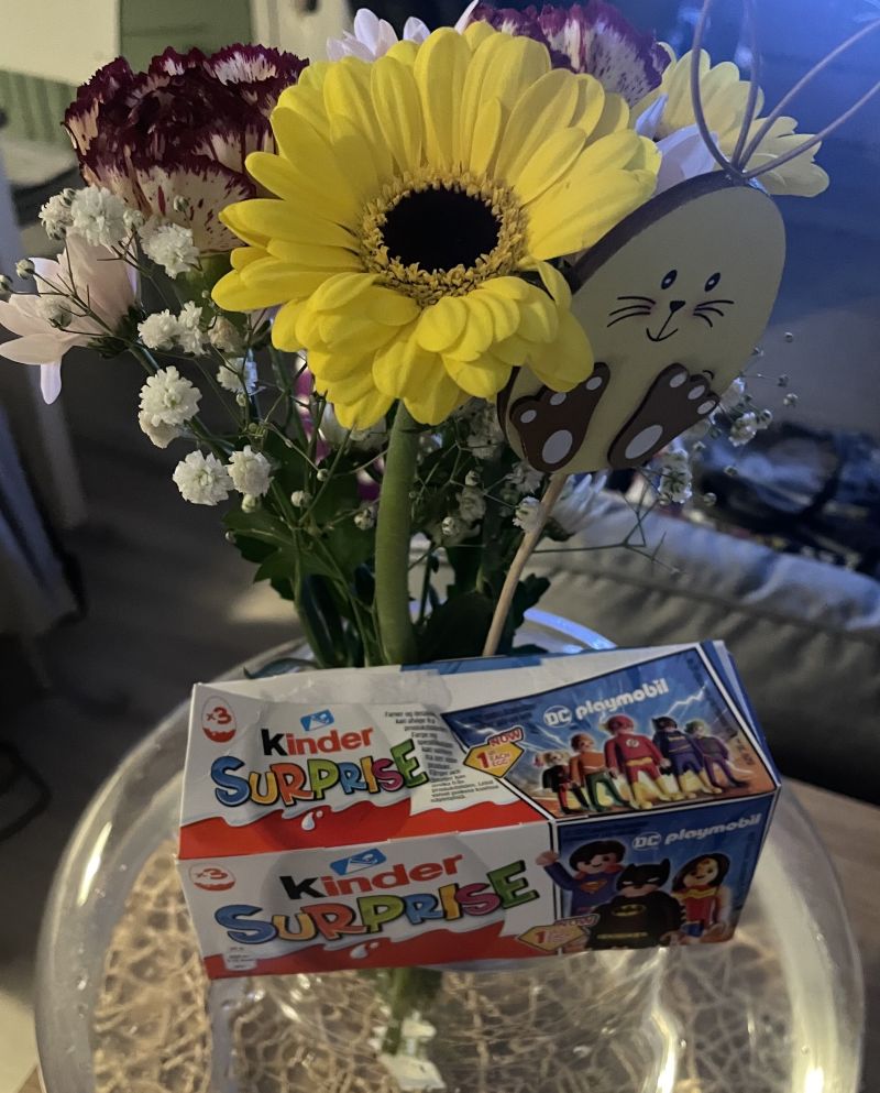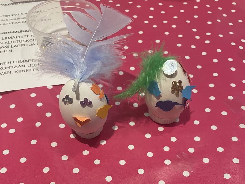 Pääsiäisen hommaa 6.4.2026 Ompelin laukun. Pääsiäismunia ja kukkia hankittu. Olin Fazerilla Mignon-munien koristelupajassa lapsen kanssa.